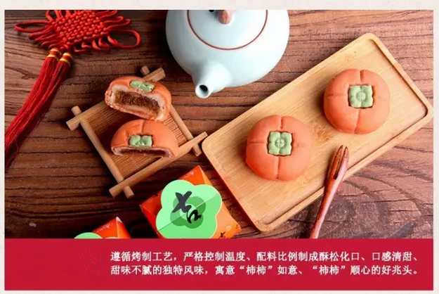 遵循烤制工藝,嚴(yán)格控制溫度、配料比例;制成酥松化口、口感清甜、甜而不膩的獨(dú)特風(fēng)味;獨(dú)特造型,寓意“柿柿”如意、“柿柿”順心的好兆頭。