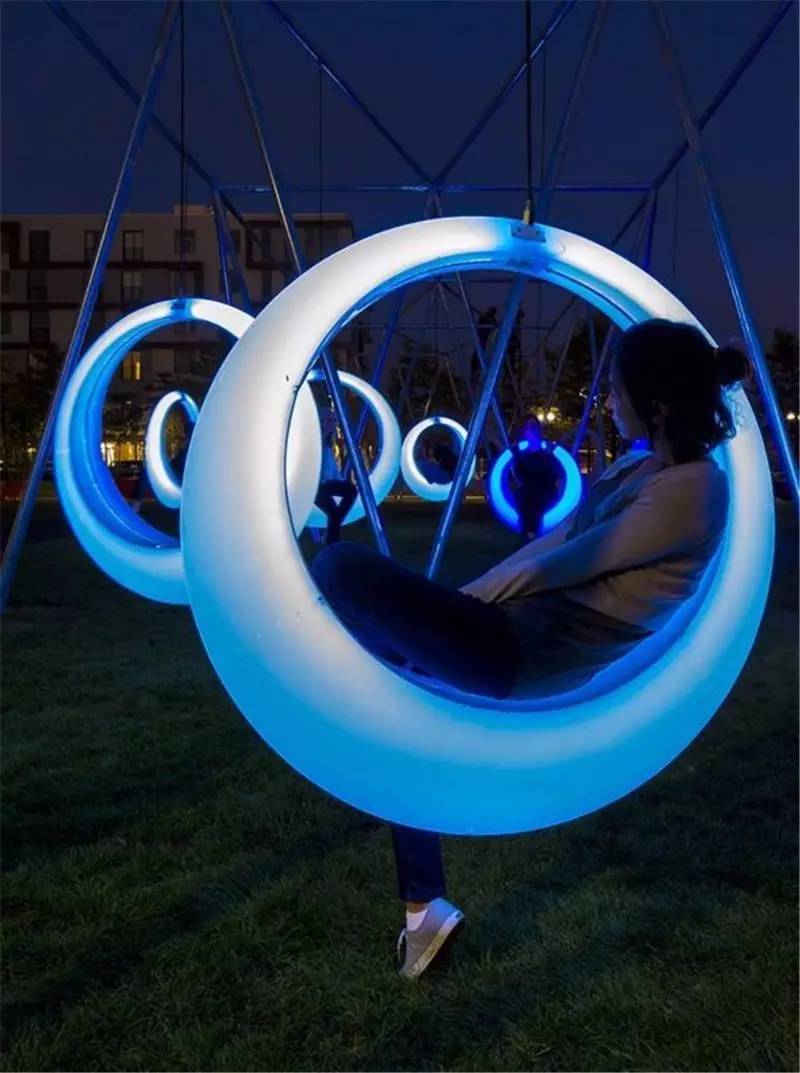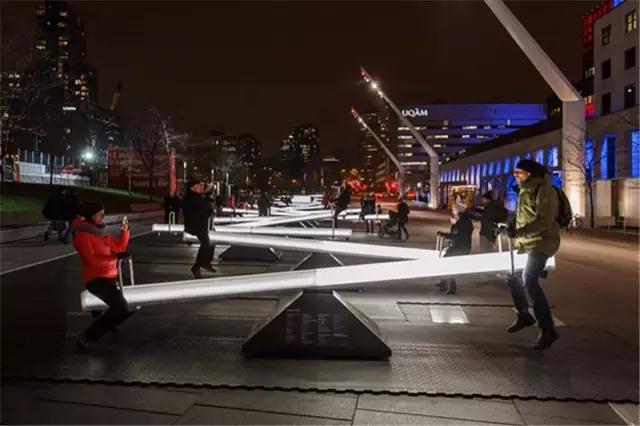 而腦洞大開的設(shè)計師們還將LED運用在公共設(shè)施上,如秋千、蹺蹺板上,組成了互動式的游樂設(shè)施,不僅構(gòu)建了一個和諧社區(qū),更是一個美麗的裝置藝術(shù)。
